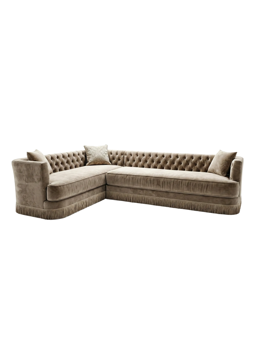 Canapé d’angle capitonné style Chesterfield, finition velours.