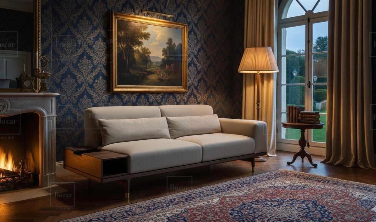 Un élément remarquable de ce canapé est la tablette latérale en bois intégrée sur le côté droit, attachée à l’accoudoir, qui peut servir de table d’appoint ou de rangement. Les pieds du canapé sont fins et semblent être en métal avec une finition en laiton, ajoutant une touche de raffinement.