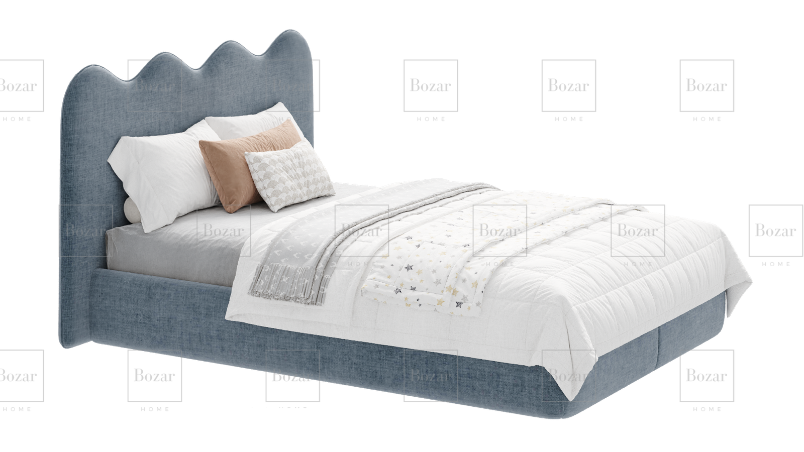 Ce lit double élégant et confortable est un ajout parfait à toute chambre à coucher. Il dispose d’une tête de lit rembourrée en forme de vagues, recouverte d’un tissu doux et de haute qualité. Le design moderne et la couleur bleue apaisante en font une pièce maîtresse attrayante pour votre espace de repos.